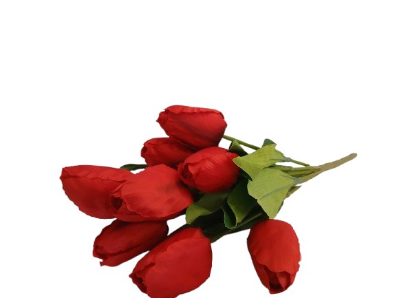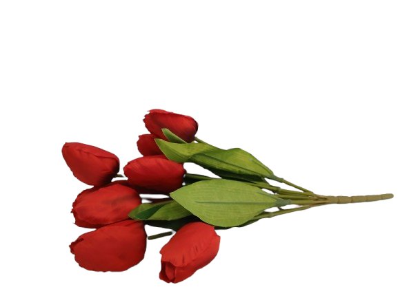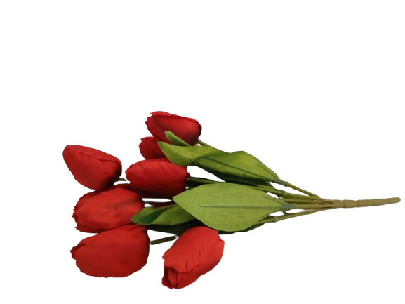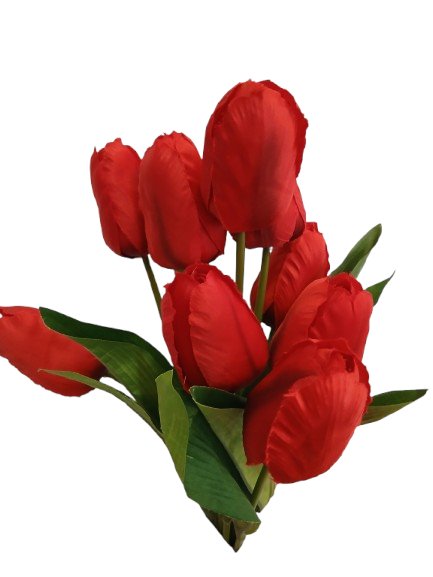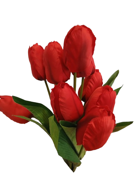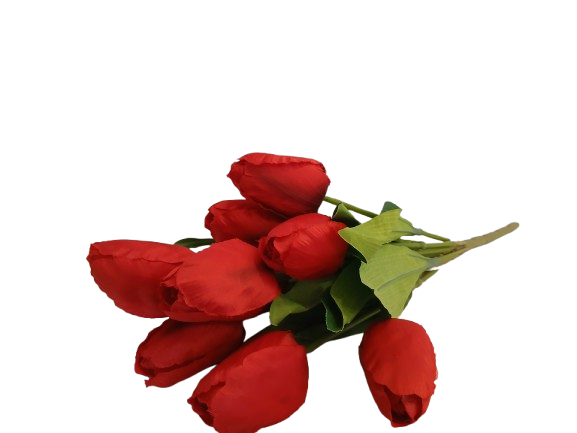 W pęczku znajduje sie 9 szt tulipanów wykonanych z materiału. Liście w kolorze zielonym wykanane z materiału.