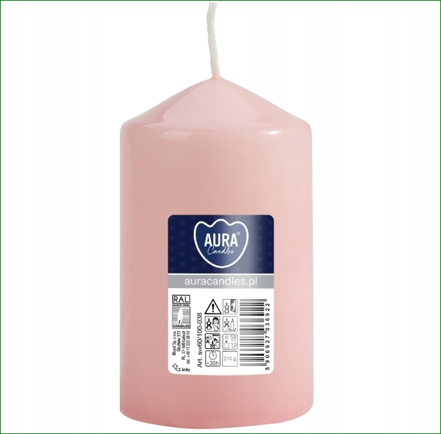 Świeca dekoracyjna w kolorze jasnego różu, kształcie walca, bezzapachowa o wysokości 10cm, średnicy 5,8cm i czasie palenia do 30 godzin BISPOL.