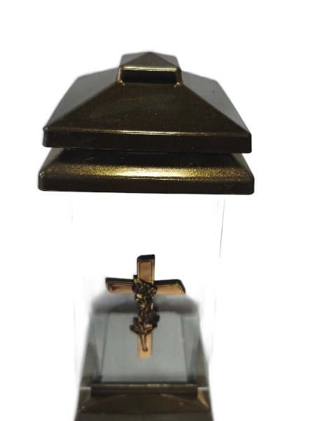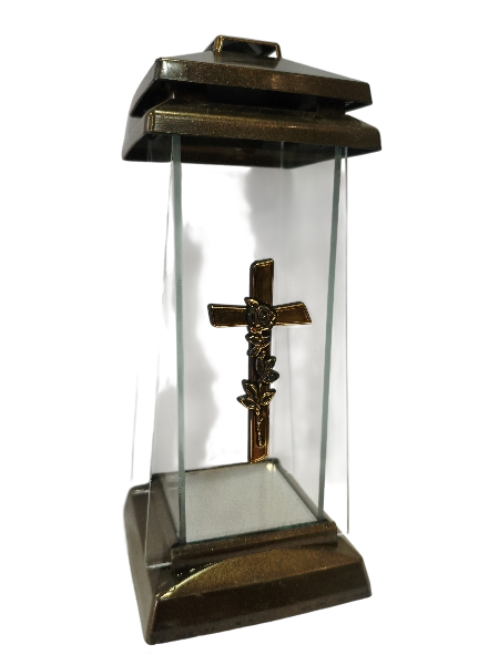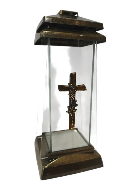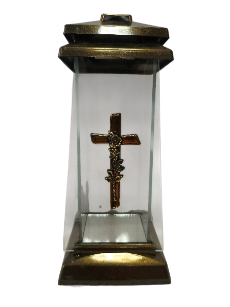 - Elegancki design z krzyżem: Znicz charakteryzuje się klasycznym, trapezowym kształtem, ozdobiony jest subtelnym krzyżem, co nadaje mu wyjątkowego charakteru i symbolicznego znaczenia. Krzyż jest wykonany z tworzywa sztucznego, co gwarantuje jego trwałość i odporność na warunki atmosferyczne.