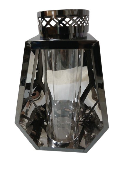Stylowy lampion dekoracyjny w kolorze grafitowym, wykonany z solidnej, połyskującej blachy. Dzięki otwartej konstrukcji boków światło jest doskonale widoczne, a umieszczona wewnątrz szklana tuba delikatnie je rozprasza, tworząc wyjątkowy efekt.