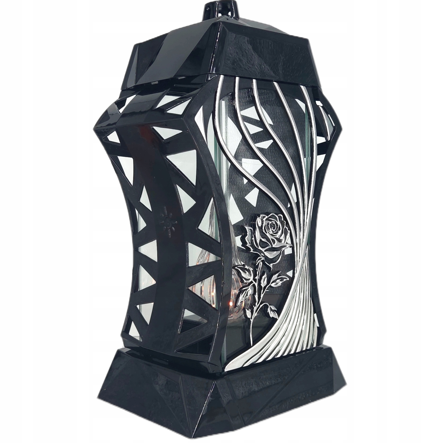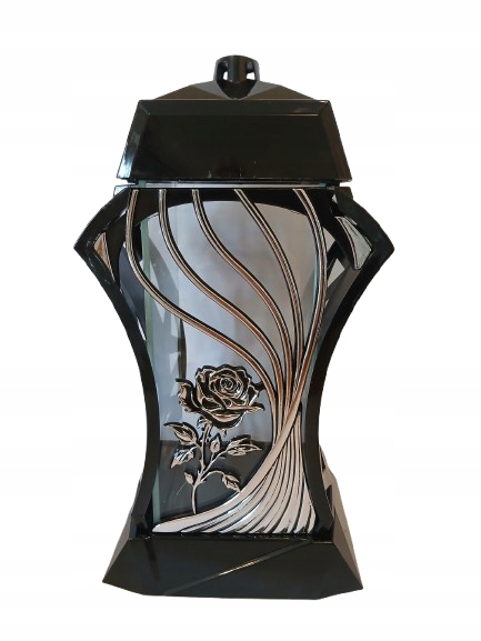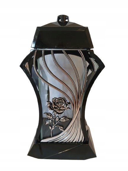 Elegancki znicz o wysokości 38cm wykonany z wysokiej jakości szkła, idealny na grób bliskiej osoby. Klasyczny design w kolorze czarnym i srebrnym nadaje mu stylowy i ponadczasowy wygląd, który pięknie prezentuje się zarówno w dzień, jak i po zmroku.