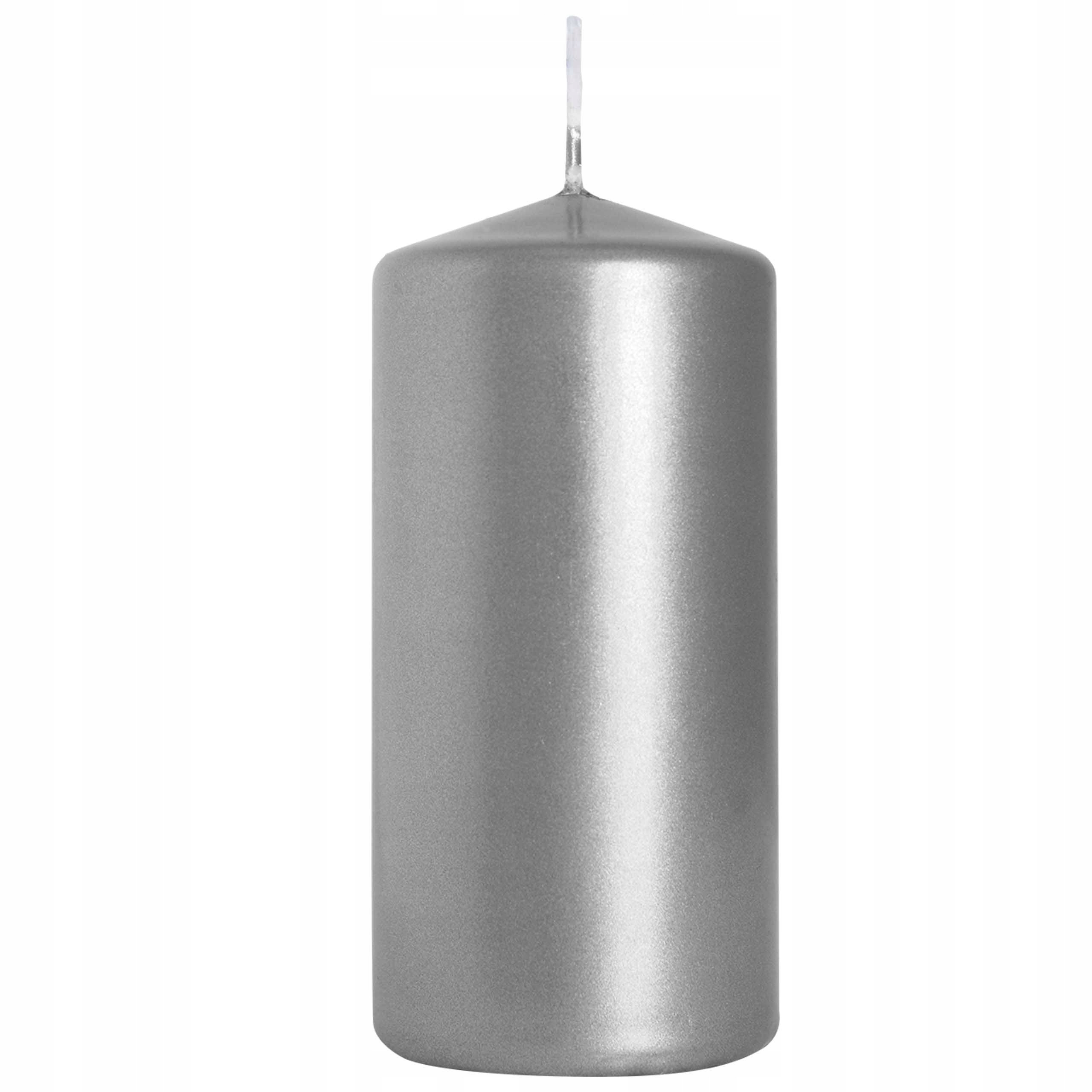 Świeca dekoracyjna w kształcie walca, w kolorze srebrny metalik, bezzapachowa o wysokości 10cm, średnicy 4,8cm i czasie palenia do 20 godzin BISPOL.
