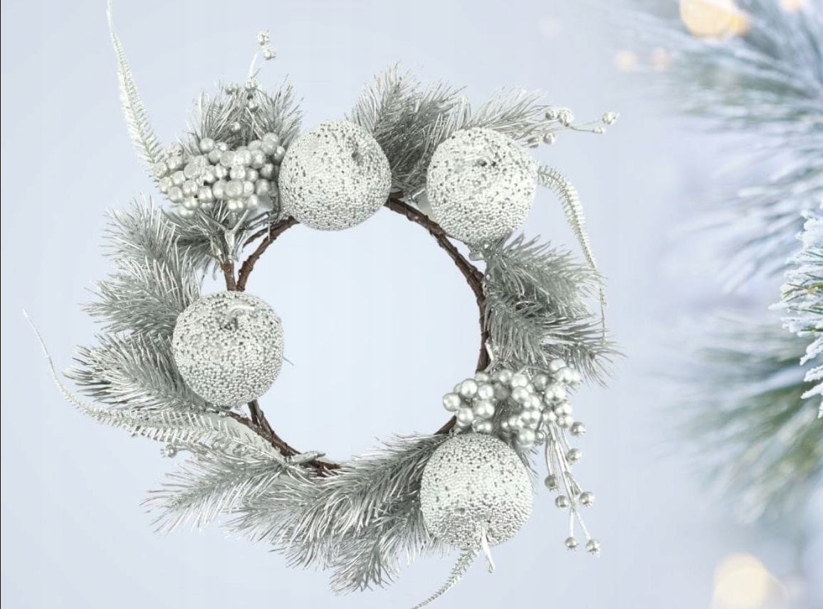 - Wianek dekoracyjny wykonany z tworzywa sztucznego w kolorze srebrnym.