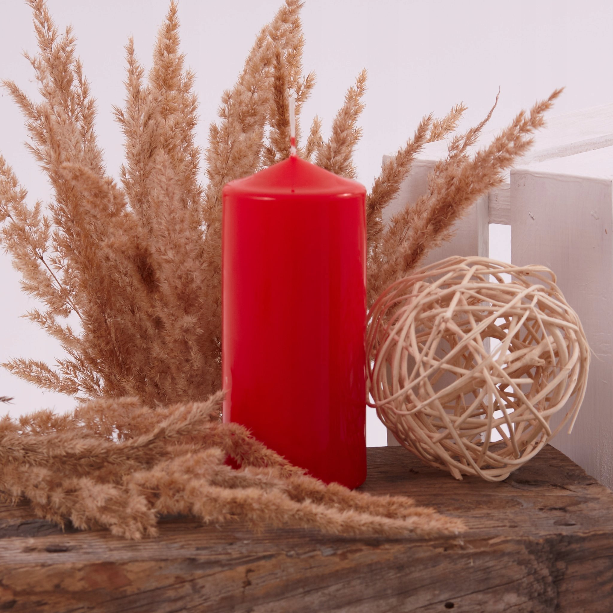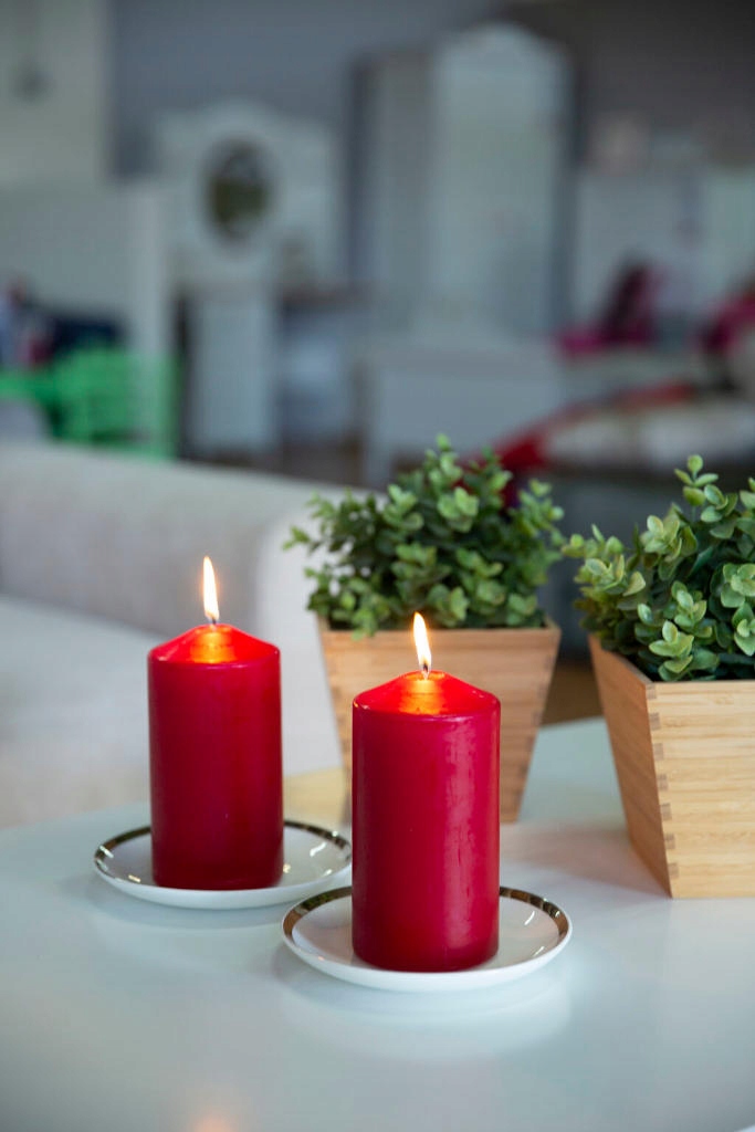 Świeca walec jest ozdobiona barwnikiem w kolorze czerwony natomiast wnętrze świecy jest w naturalnym białym kolorze, co jest widoczne podczas spalania. Klasyczny kolor świecy doskonale podkreśla piękno całej świecy.