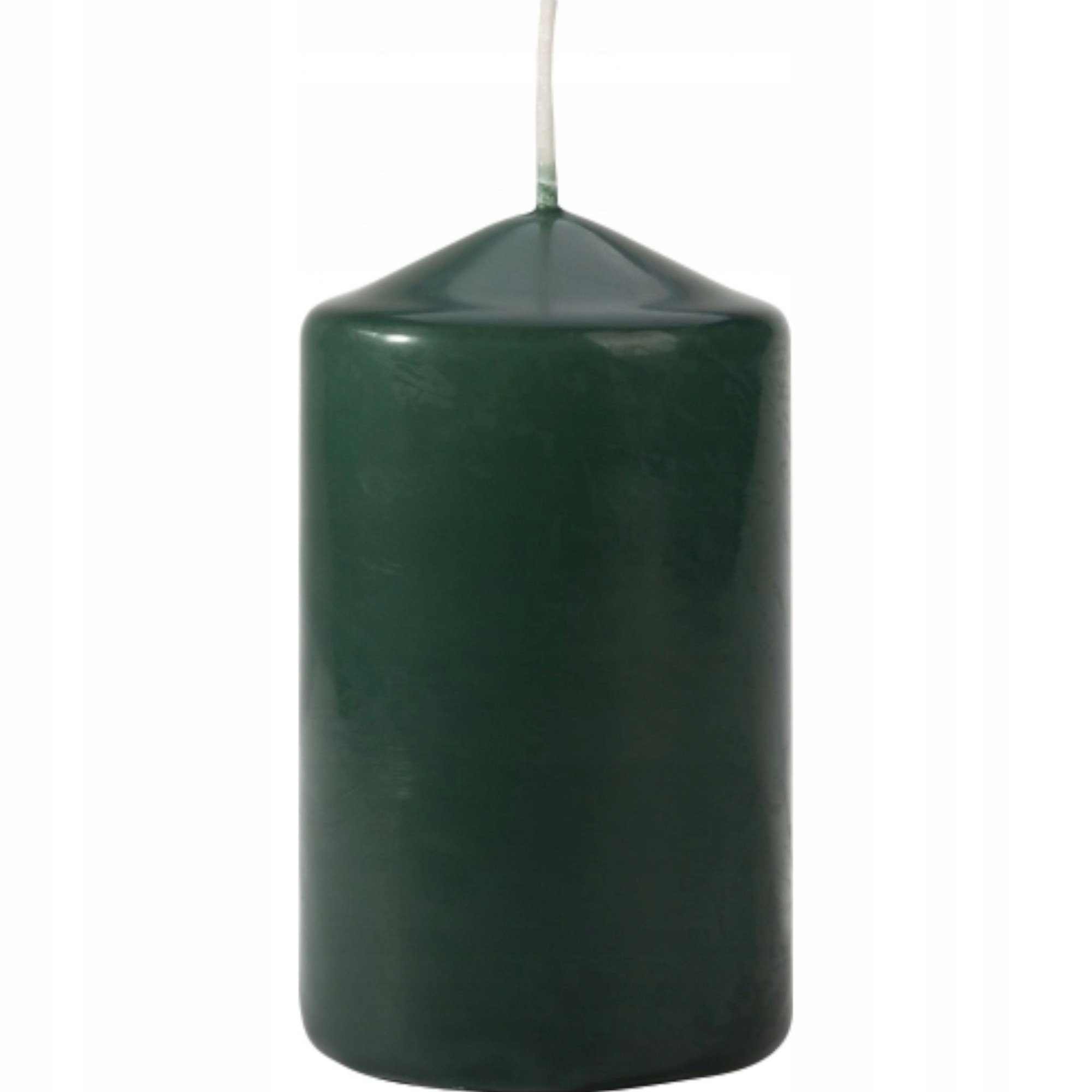 Świeca dekoracyjna w kolorze butelkowej zieleni, kształcie walca, bezzapachowa o wysokości 10cm, średnicy 5,8cm i czasie palenia do 30 godzin BISPOL.