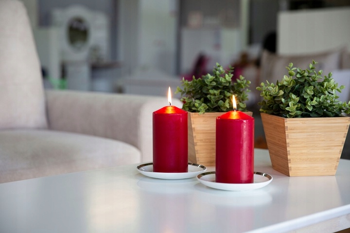 Świeca walec jest ozdobiona barwnikiem w kolorze czerwony, natomiast wnętrze świecy jest w naturalnym białym kolorze, co jest widoczne podczas spalania. Klasyczny kolor świecy doskonale podkreśla piękno całej świecy.