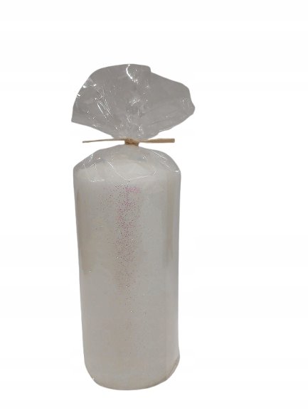 Świeca walec biała błyszcząca z brokatem.