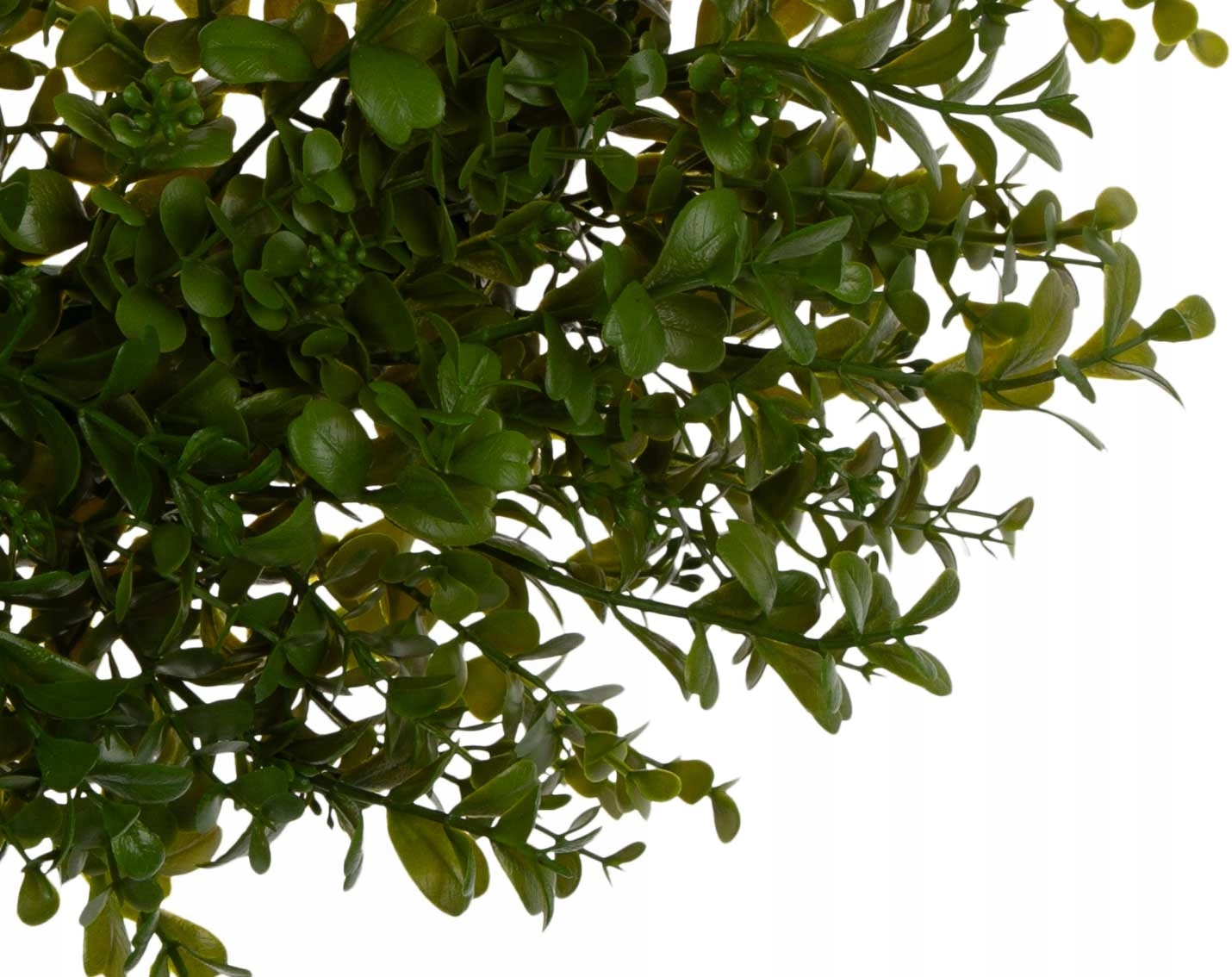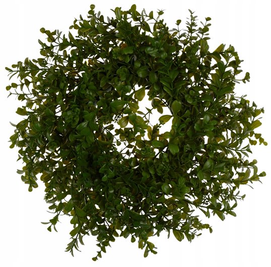 Wianek wykonany z tworzywa sztucznego w kolorze zielonym imitujący roślinę bukszpan. Wianek idealny do dekoracji.