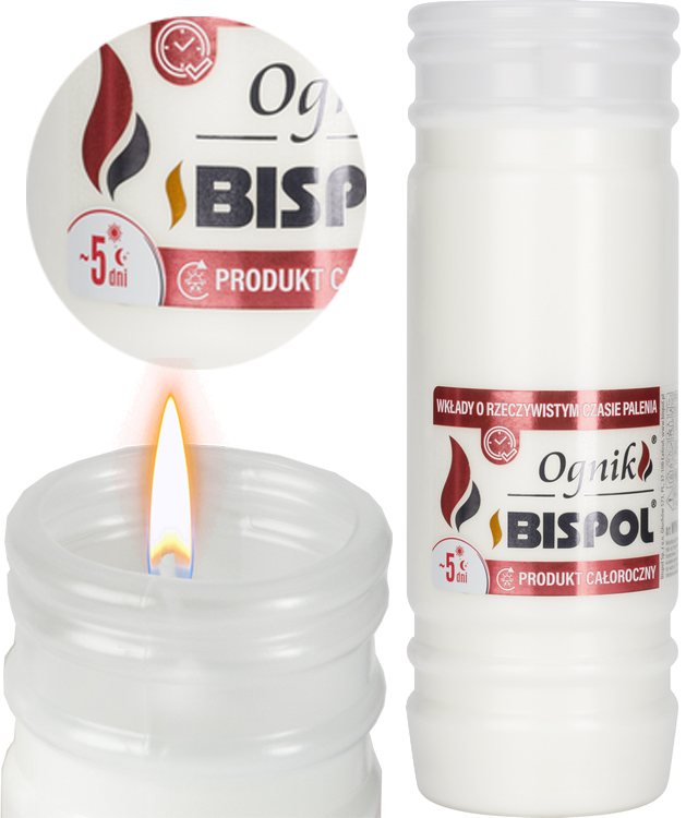 Wkłady do zniczy Bispol są idealnym rozwiązaniem całorocznym, sprawdzającym się w różnych warunkach pogodowych. Standardowe kształty oraz szeroka dostępność (różnorodność) wymiarów wkładów umożliwiają dopasowanie do wszystkich zniczy dostępnych na rynku.