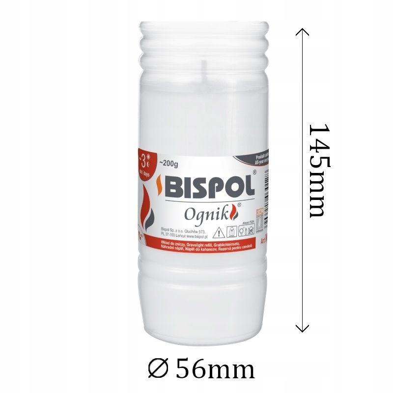 Wkłady parafinowe do zniczy Bispol Ognik wykonane są z wysokiej jakości parafiny, dzięki której palą się maksymalnie długo nie kopcą i wypalają się do końca. Osłonka wykonana jest z trwałego tworzywa sztucznego o wysokiej przepuszczalność światła płomienia oraz odpornego na wysoką temperaturę , a umieszczony centralnie pośrodku knot nie pozwala na topienie się ścianek i niszczenie znicza.