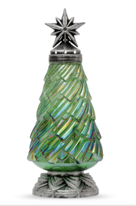 Znicz Bożonarodzeniowy w kolorze zielonym szkło tęczowe w kształcie choinki.
