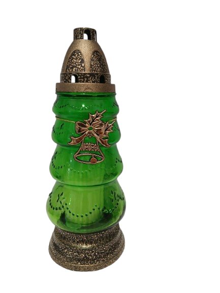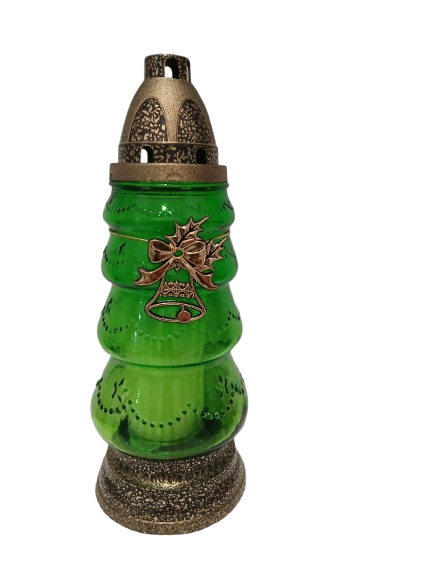 Znicz Bożonarodzeniowy w kolorze zielonym w kształcie choinki z dzwonkiem w kolorze złotym 28 cm.