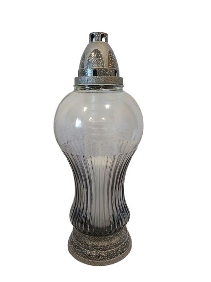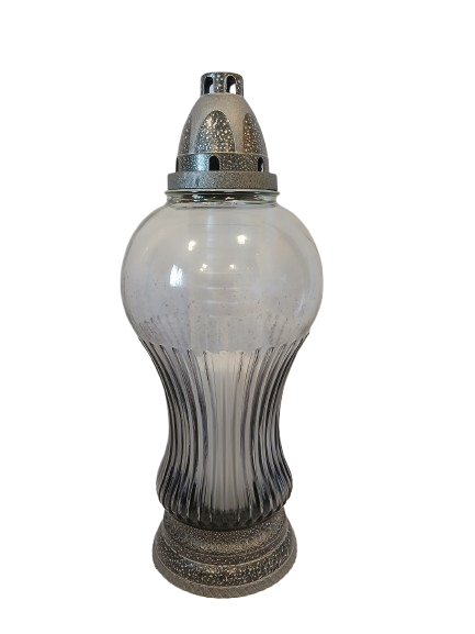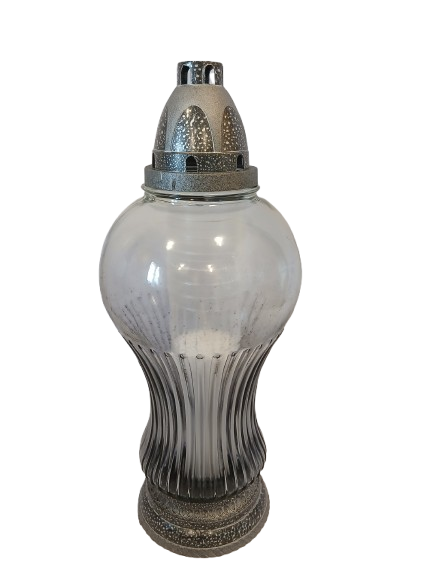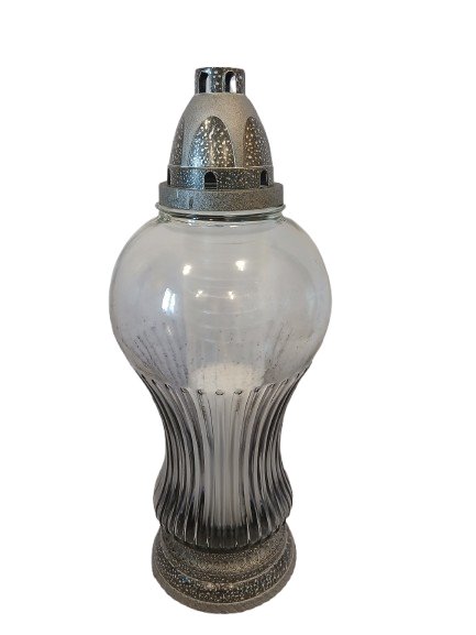 Znicz całoroczny wykonany z przydymionego szkła w kolorze grafitowym ,stabilny.