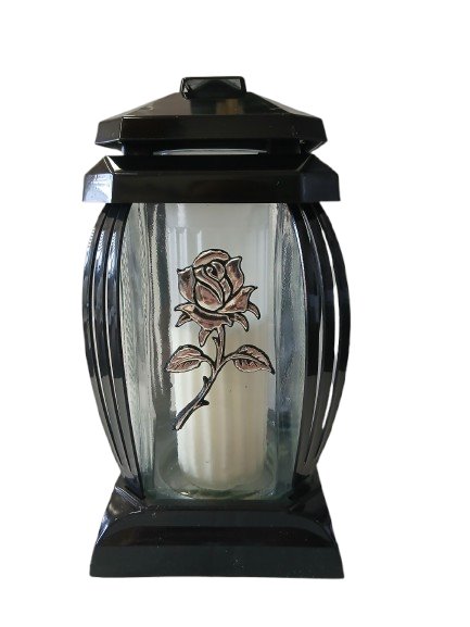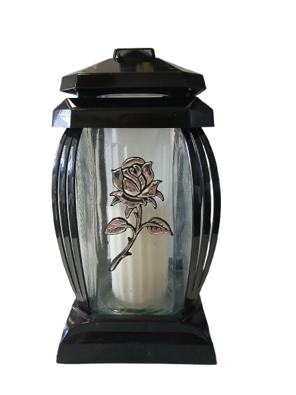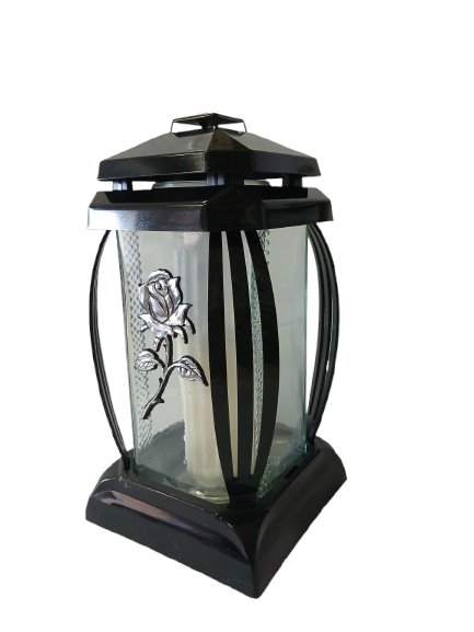 Znicz wykonany z bezbarwnego szkła oraz z tworzywa sztucznego, kapturek i podstawa w kolorze czarnym, róża w kolorze srebrnym.