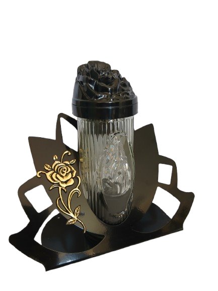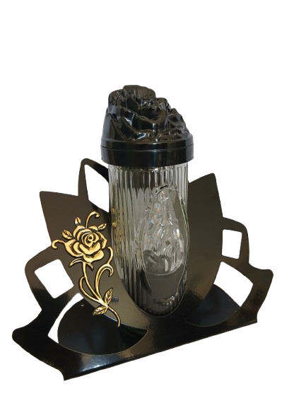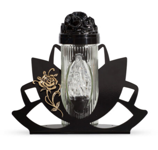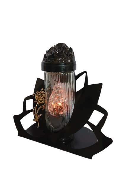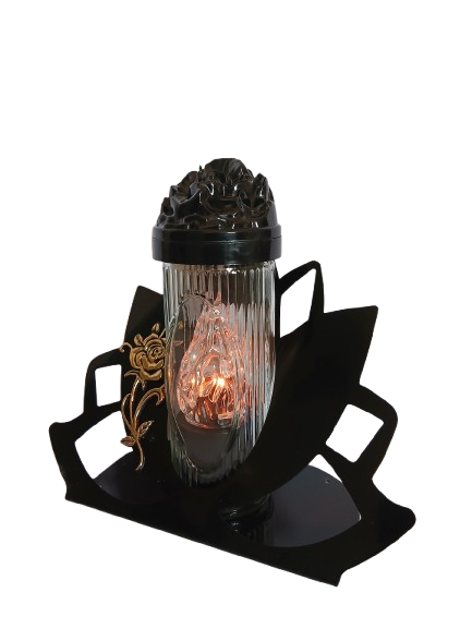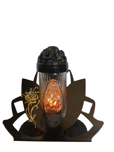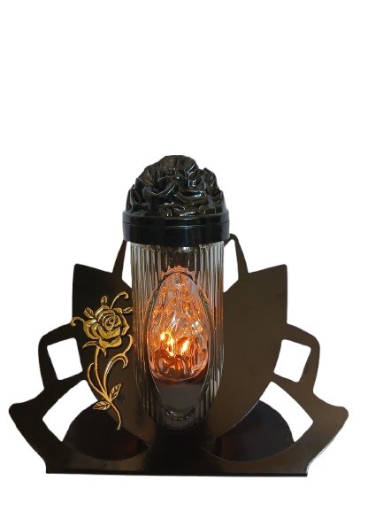 Nowoczesna kapliczka, znicz metalowa z złotą różą.