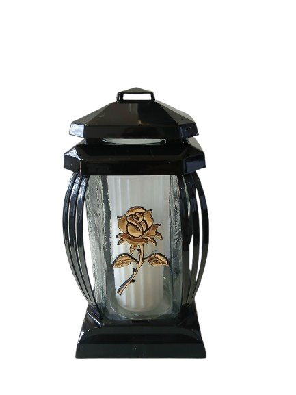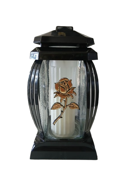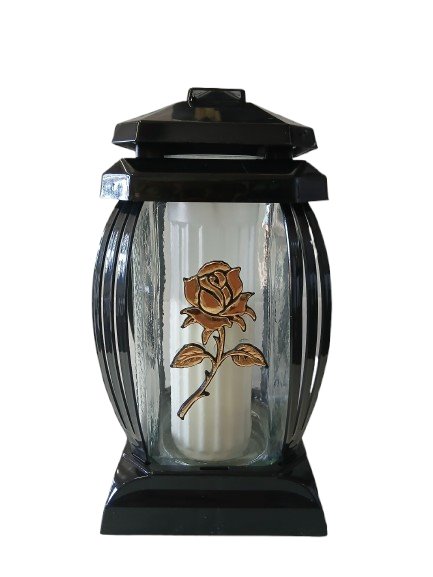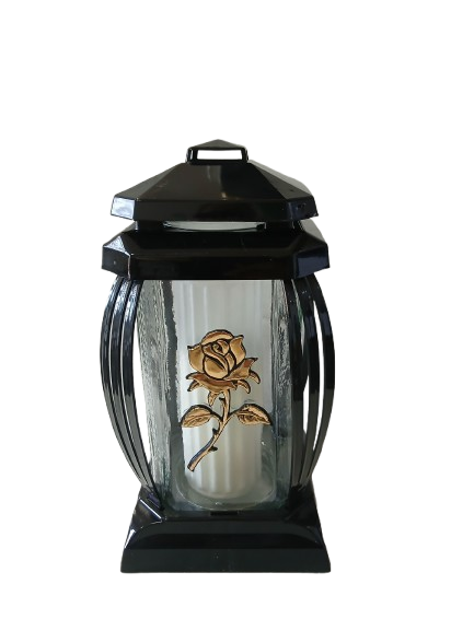 Znicz kapliczka wykonany z bezbarwnego szkła oraz tworzywa sztucznego w kolorze czarnym, dekoracja róża w kolorze złotym.