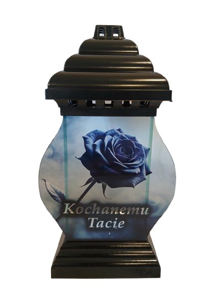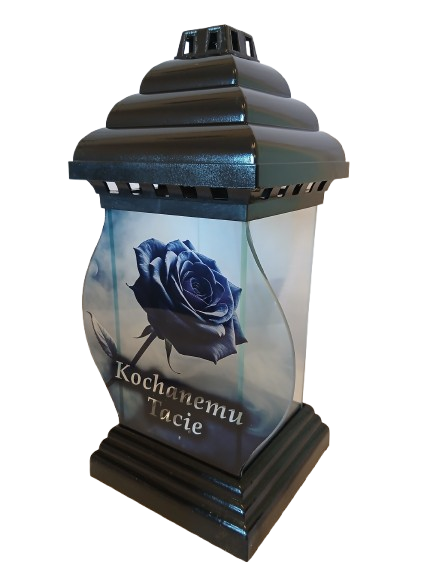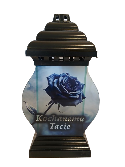 Znicz wykonany z bezbarwnego szkła oraz z tworzywa sztucznego w kolorze czarnym, kapturek i podstawa w kolorze czarnym, róża i sentencja jest dekoracją kapliczki.