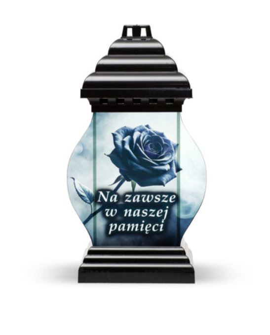 Znicz wykonany z bezbarwnego szkła oraz z tworzywa sztucznego w kolorze czarnym, kapturek i podstawa w kolorze czarnym, róża i sentencja jest dekoracją kapliczki.
