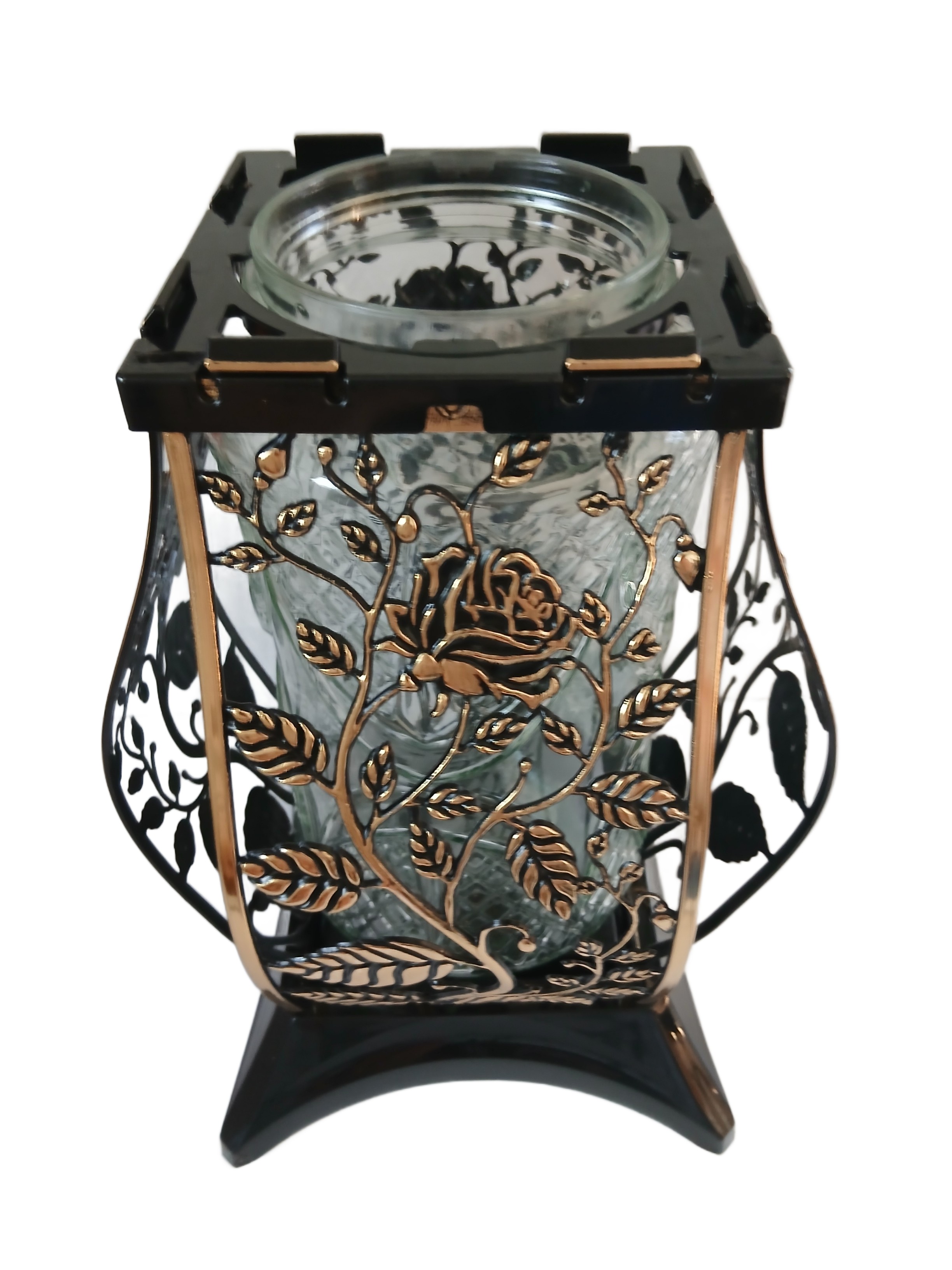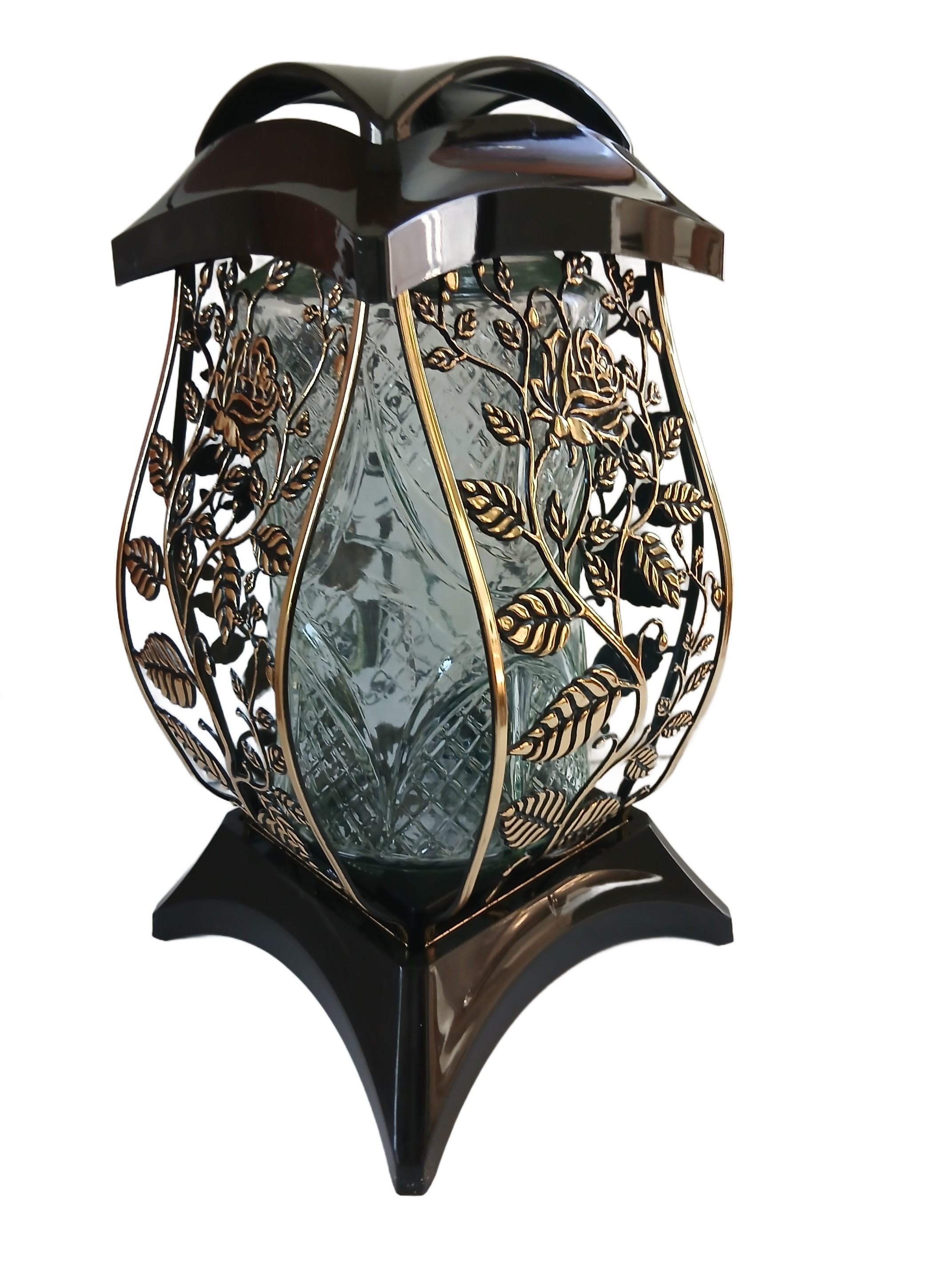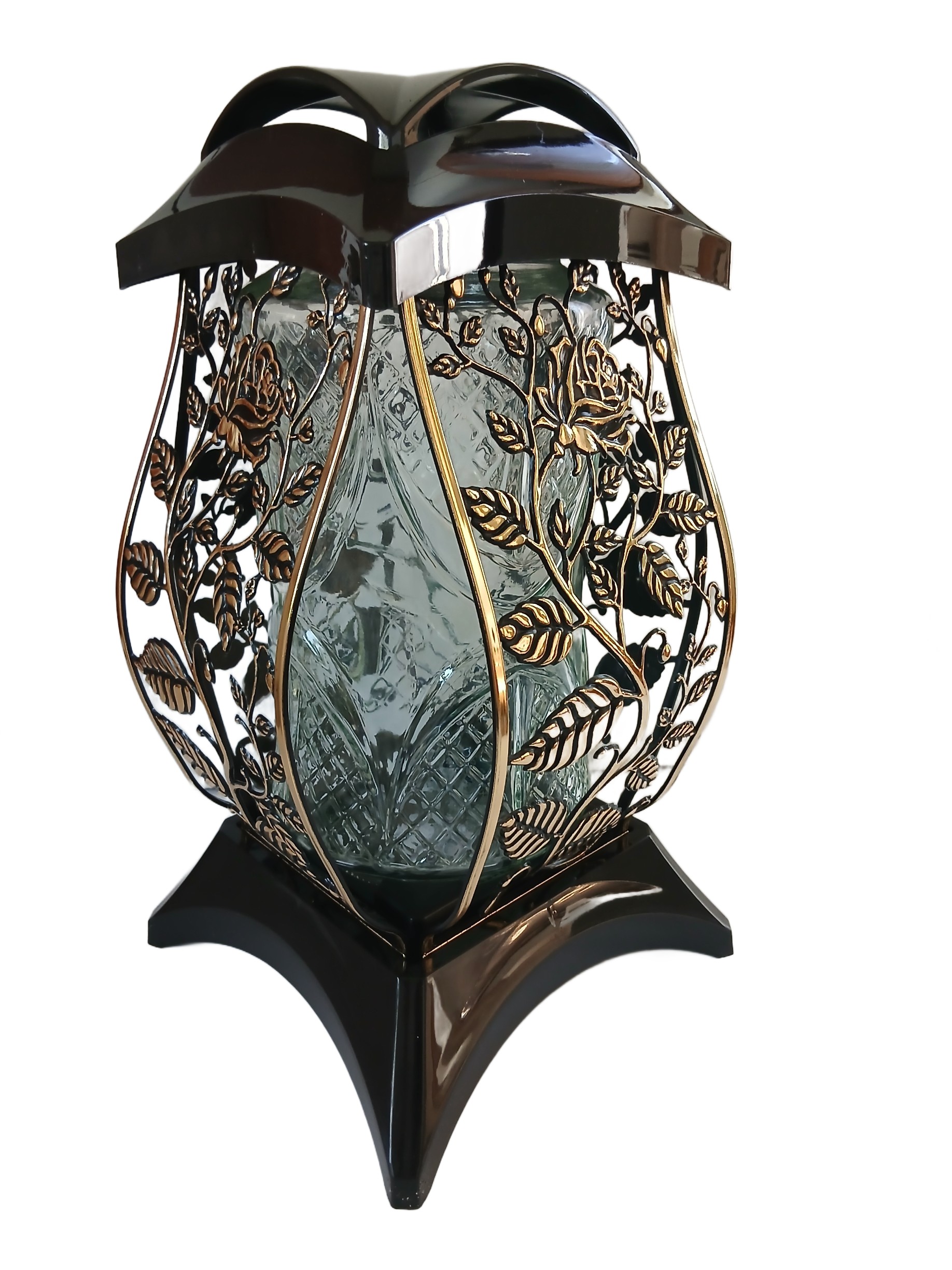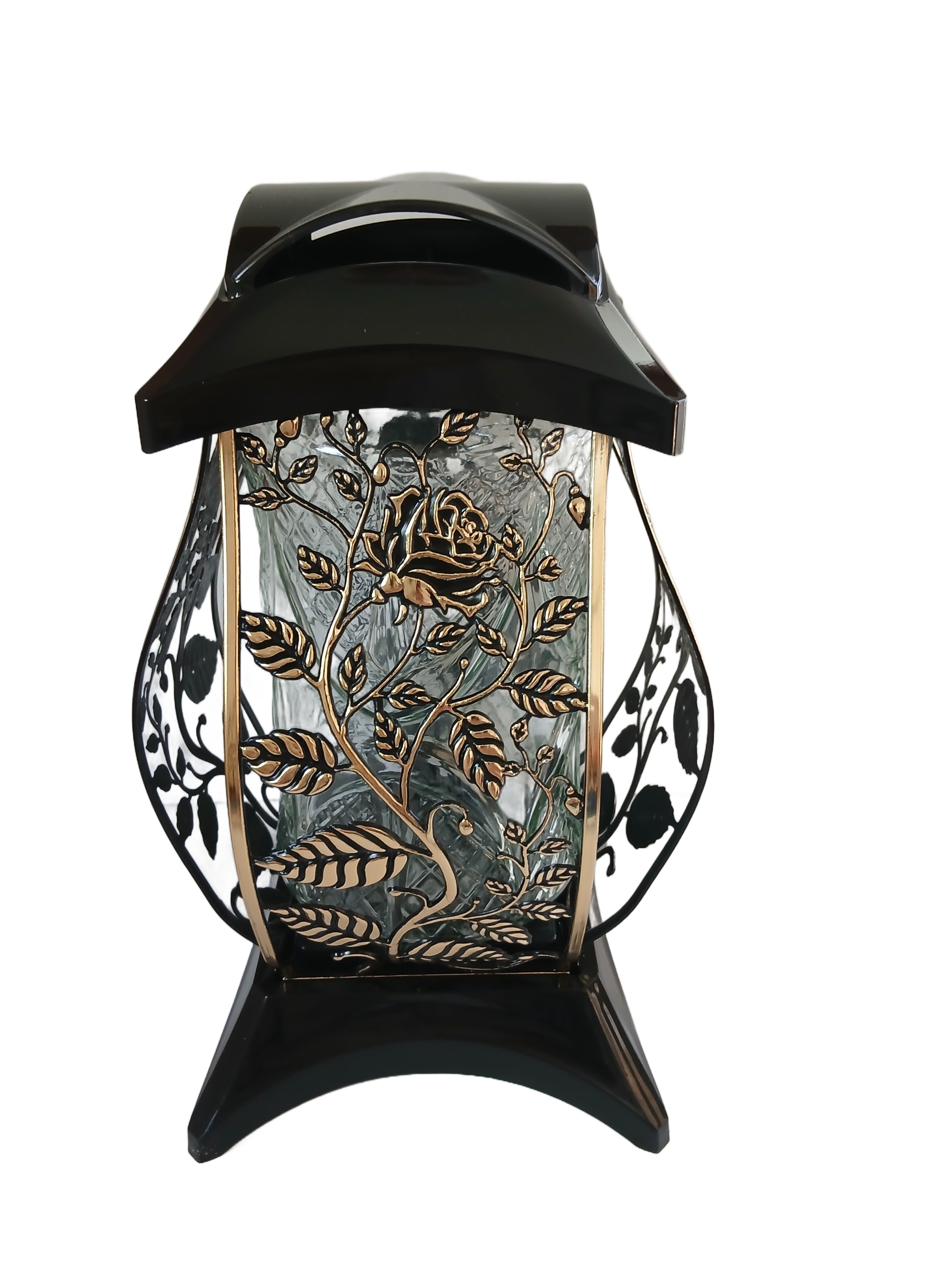 Duży Znicz na Grób 35 cm Czarny Lampion Ażurowy Cebula ZŁOTY Dekor Róża