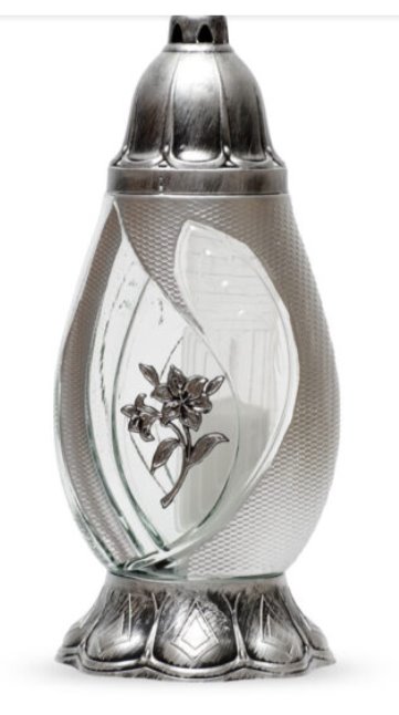 Róża ozdobna w kolorze srebrnym, dodatkowo na przodzie znicza dekor malowany w kolorze srebrnym.