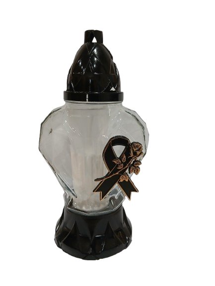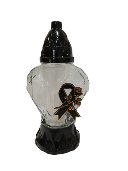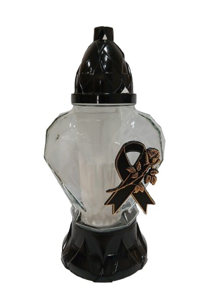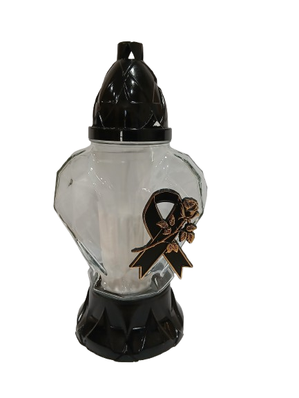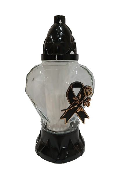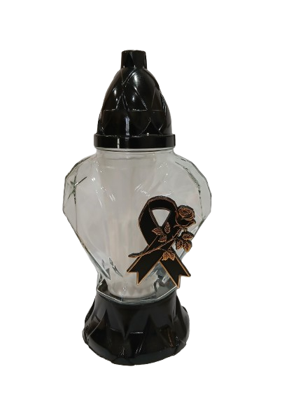 Elegancki znicz szklany w kształcie serca to klasyczna i stonowana forma pamięci o bliskich. Czarna podstawa i kopułka nadają mu podniosłego charakteru, a ozdobna aplikacja w formie róży z kokardą podkreśla wyjątkowy, żałobny styl.