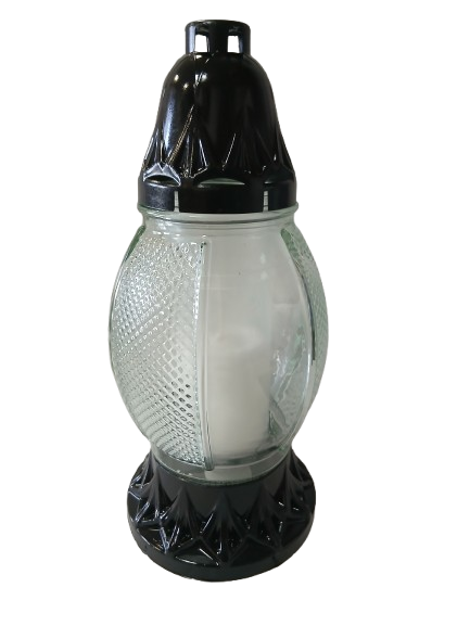 Znicz całoroczny prosty bez dodatków z czarnymi dodatkami.Znicz wykonany ze szkła bezbarwnego dodatki w kolorze czarnym wykonane z tworzywa sztucznego.