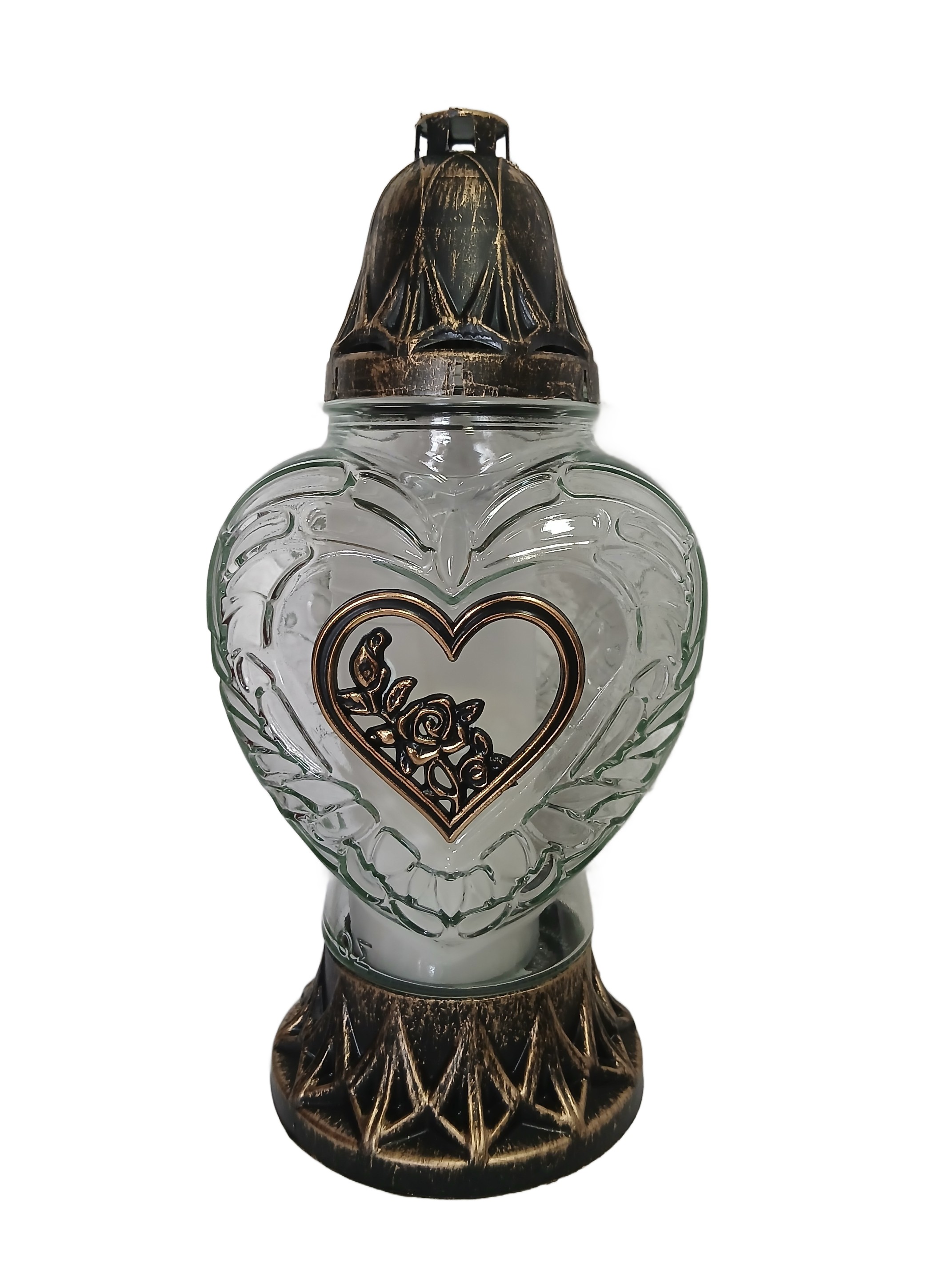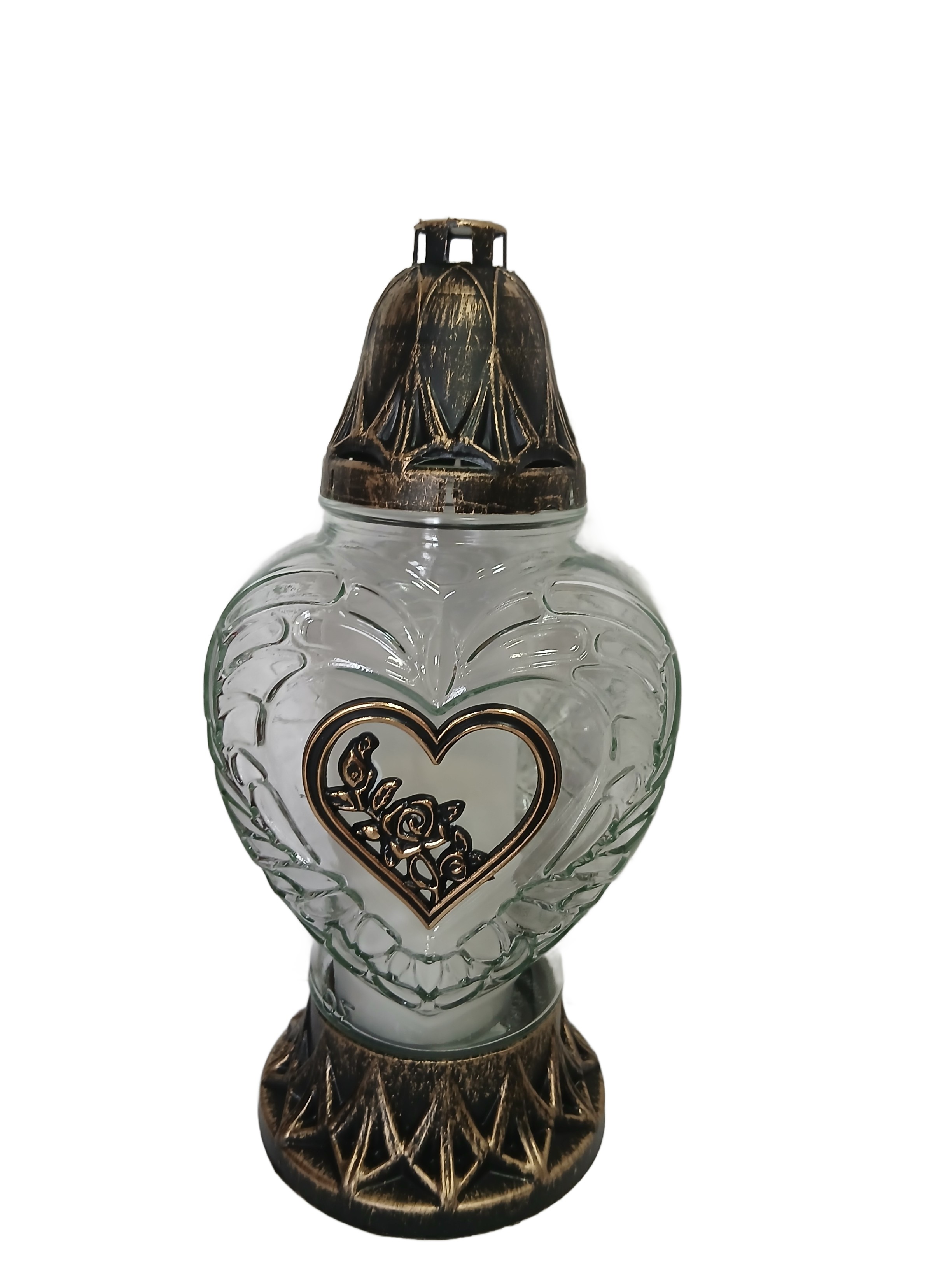 Znicz Szklany Czarny z złotym Sercem i Różą – 28 cm