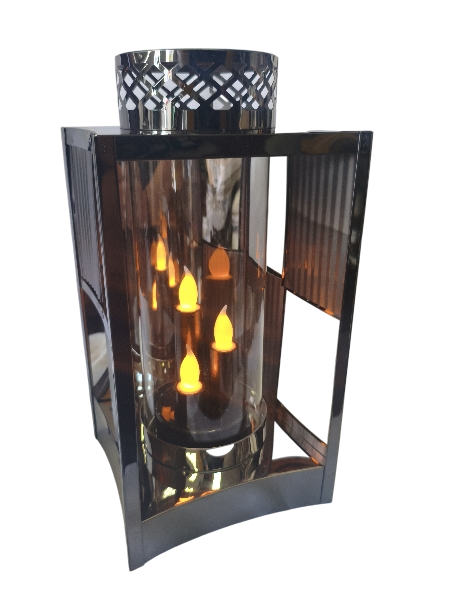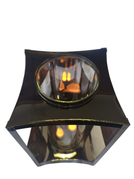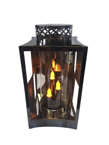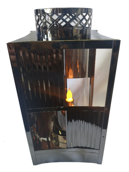 Stylowy lampion dekoracyjny w kolorze grafitowym, wykonany z solidnej, połyskującej blachy. Dzięki otwartej konstrukcji boków światło jest doskonale widoczne, a umieszczona wewnątrz szklana tuba delikatnie je rozprasza, tworząc wyjątkowy efekt.