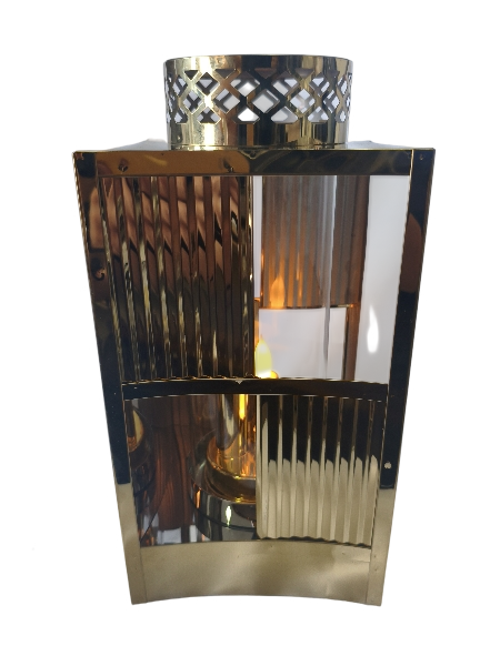 Stylowy lampion dekoracyjny w kolorze złotym, wykonany z solidnej, połyskującej blachy. Dzięki otwartej konstrukcji boków światło jest doskonale widoczne, a umieszczona wewnątrz szklana tuba delikatnie je rozprasza, tworząc wyjątkowy efekt.