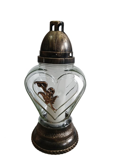 Elegancki znicz wykonany ze szkła, zdobiony złotą kalią. Połączenie czerni i srebra nadaje mu wyjątkowy, ponadczasowy charakter. To produkt solidny, estetyczny i funkcjonalny, przeznaczony do różnych rodzajów wkładów.