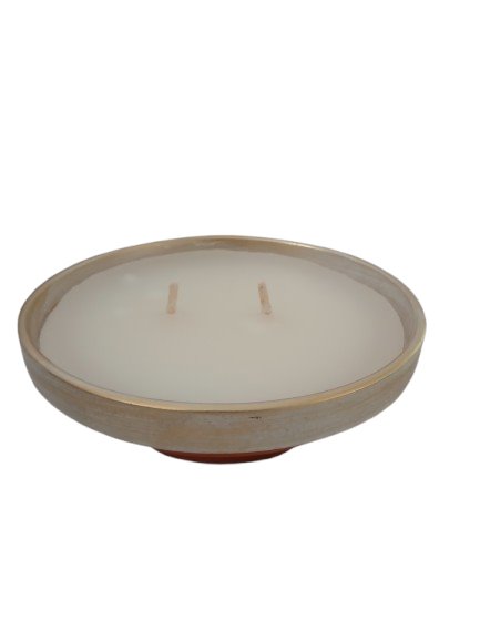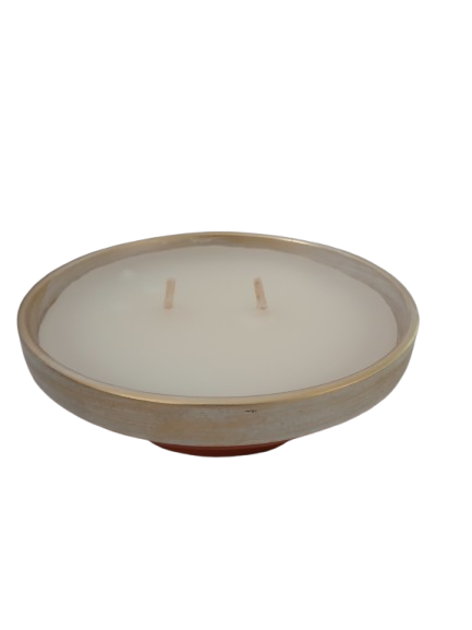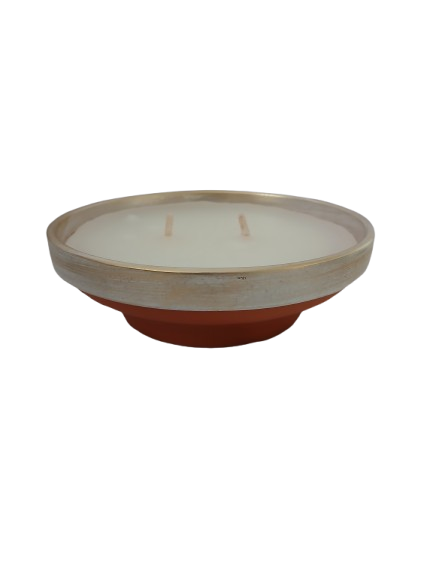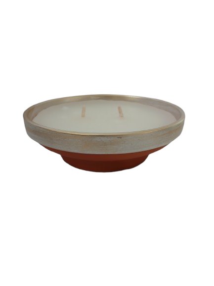 Znicz zalewany parafinowy z złotym otokiem, podstawa gliniana.